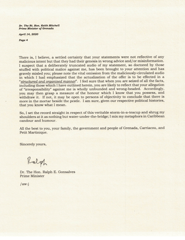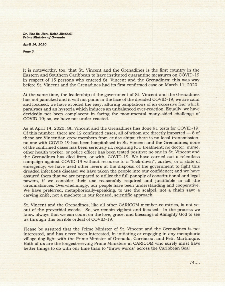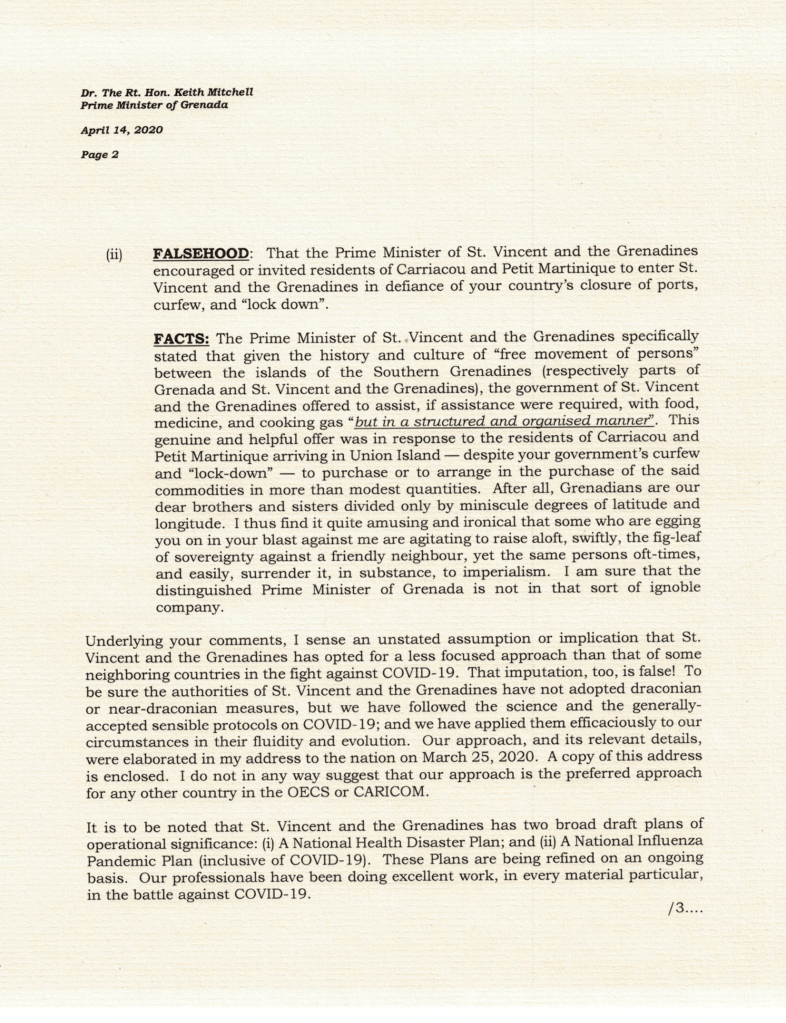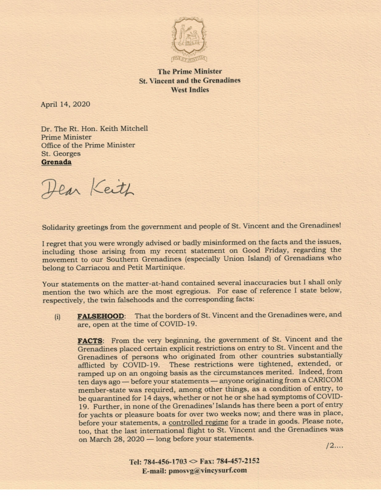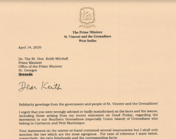 Kingstown, St. Vincent (ONE NEWS SVG) – Prime Minister Dr. Ralph Gonsalves has written a letter to the Grenada’s Prime Minister, Dr. Keith Mitchell over the impasse resulting from Dr. Gonsalves’ invite to people of Carriacou and Petite Martinique to get supplies in St. Vincent, if they have difficulties getting them.