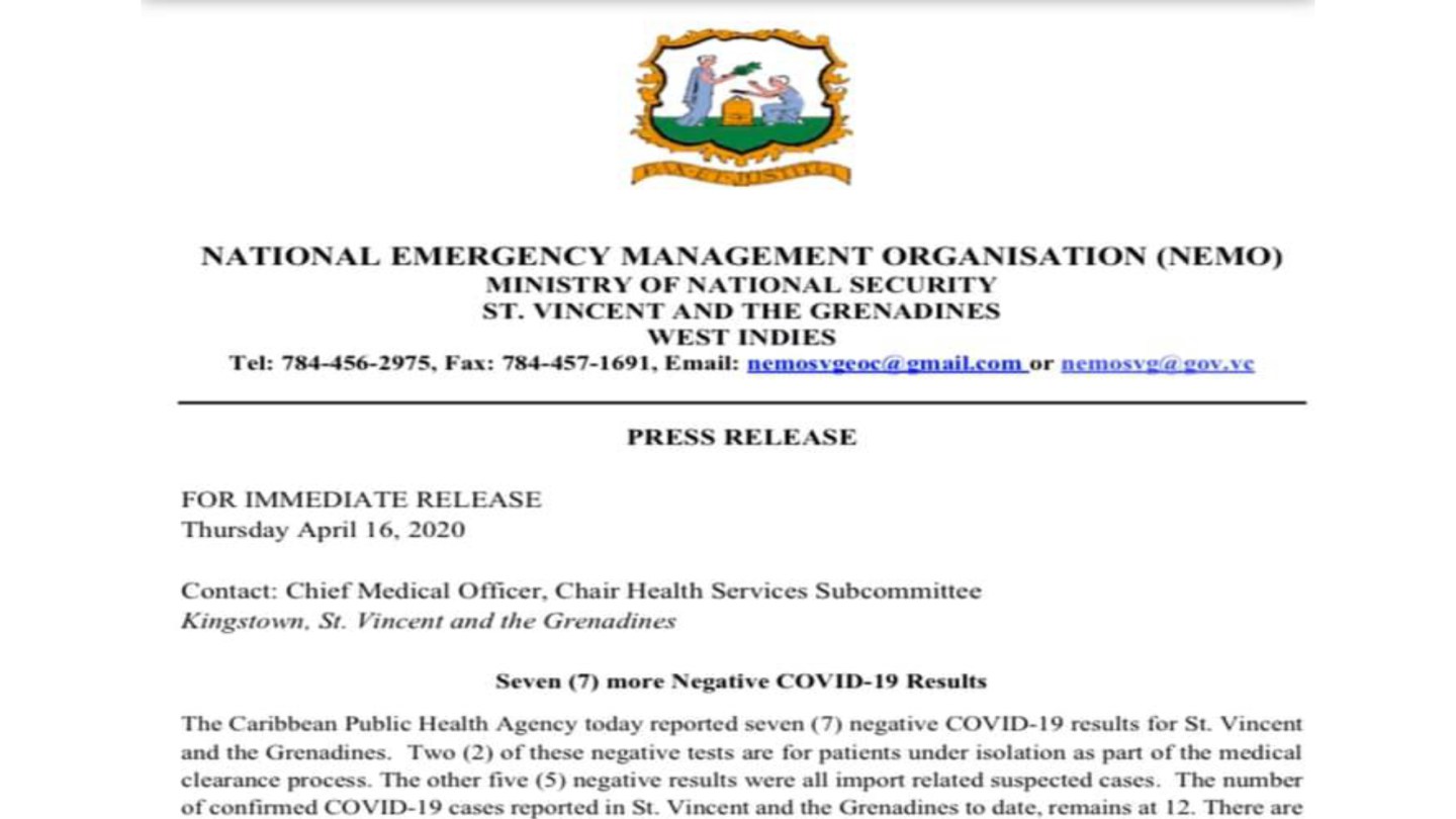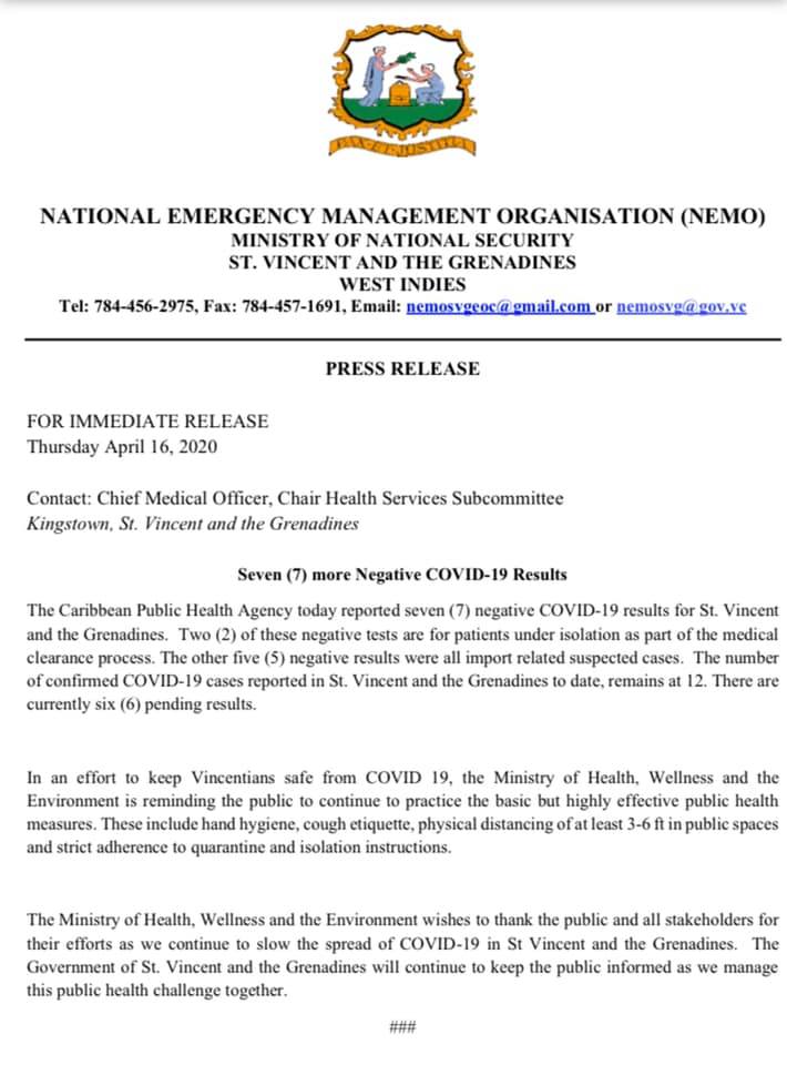 A release from the National Emergency Management Organization – NEMO stated Thursday April 16 that the Caribbean Public Health Agency reported seven (7) negative Covid-19 results.