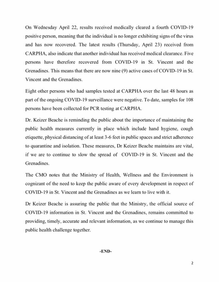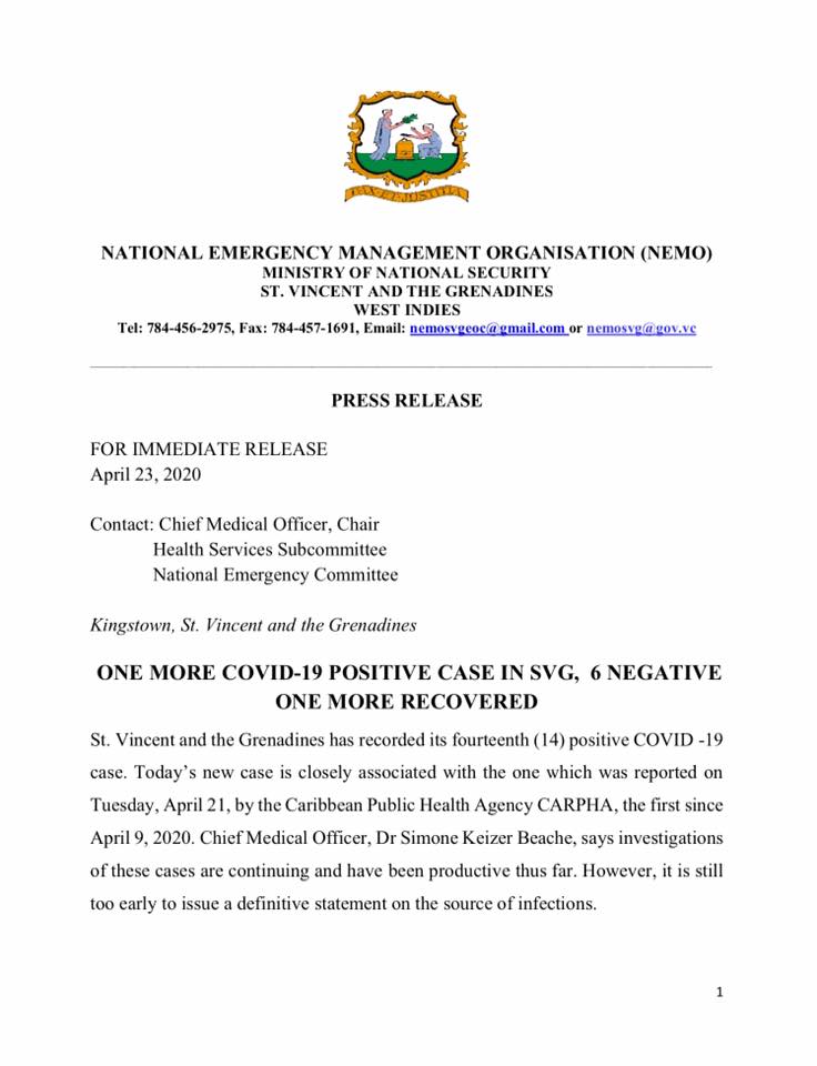 A release from the National Emergency Management Organization (NEMO) today (April 23) said that today’s case “is closely associated with the one which was reported on Tuesday April 21 by the Caribbean Public Health Agency”.