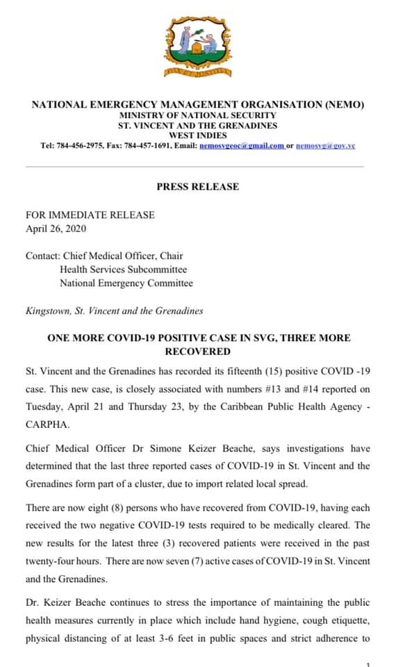 In a release on Sunday, the National Emergency Management Organization (NEMO) said the new case “is closely associated with #12 and #14 reported on Tuesday, April 21 and Thursday 23rd, by the Caribbean Public Health Agency”.