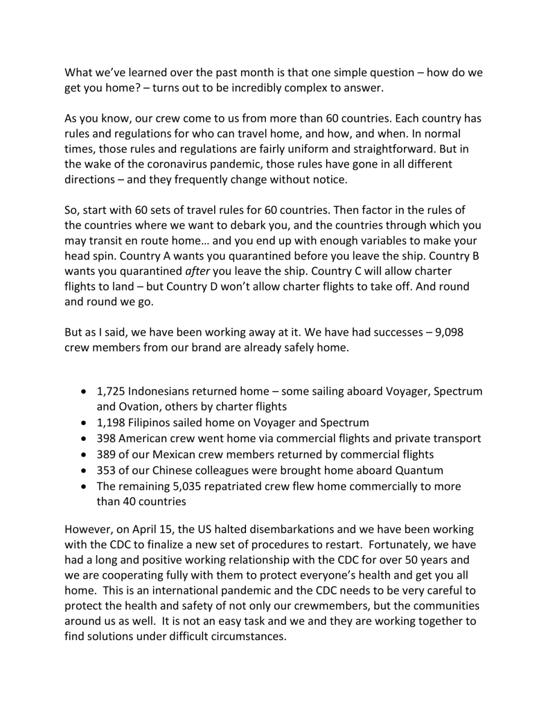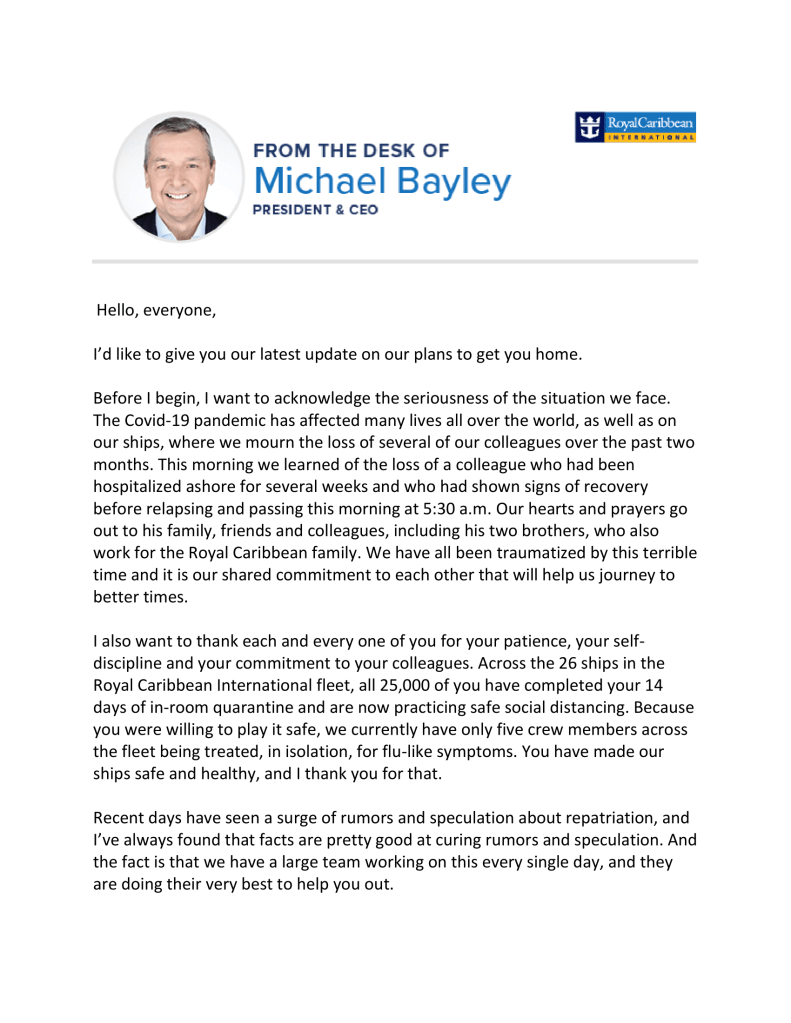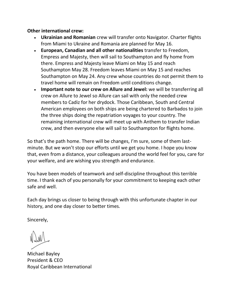 The memo from the desk of President and CEO of Royal Caribbean International, Michael Bayley states, however, that the current repatriation plans, are “pending approval from various governments”, and that the dates provided are “a rough estimate”.