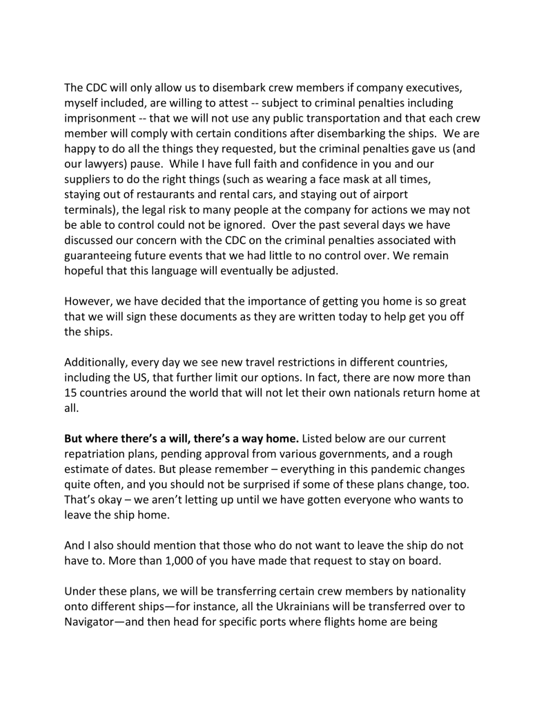 The memo sent to staff also outlined the departure dates for crew from different regions.