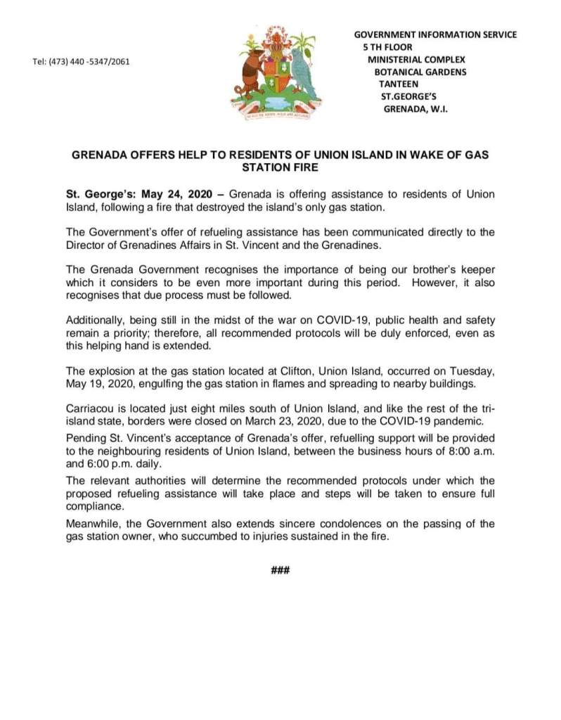 (PRESS STATEMENT) St. George’s: May 24, 2020 – Grenada is offering assistance to residents of Union Island, following a fire that destroyed the island’s only gas station.