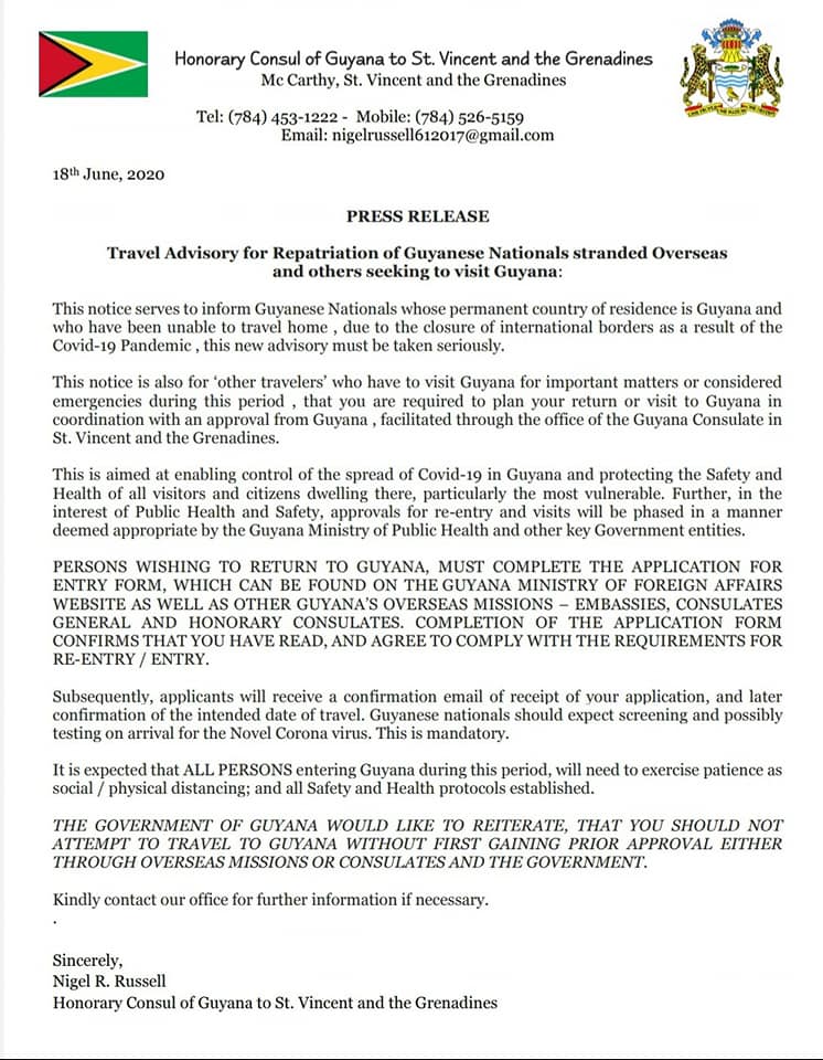 Guyanese wishing to travel home, or persons wishing to visit Guyana “are required to plan your return or visit to Guyana in coordination with an approval from Guyana, facilitated through the office of the Guyana Consulate in St. Vincent and the Grenadines”, Russell says.