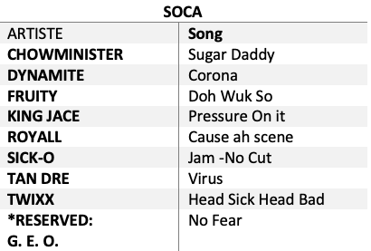 There were three categories; Ragga Soca which had 15 entries, Soca 19 entries and Calypso with 9 entries. Each category was judged out of 100 points which included criteria such as lyrics, melody, originality, among others. Moreover, 7 persons were chosen from each category to go forward to compete in the final round for $20,000xcd in cash and prizes. The event would be held at Envy Night Club on the 4th and 5th of July 2020 and streamed live via Stv Online network.