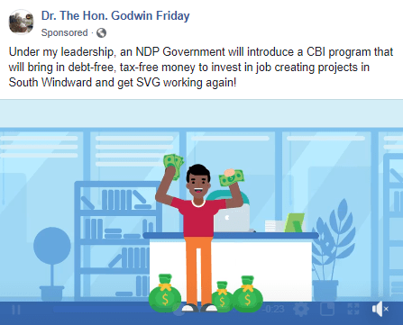 In a sponsored Facebook post from his official page, Dr. Friday said “Under my leadership, an NDP Government will introduce a CBI program that will bring in debt-free, tax-free money to invest in job creating projects in South Windward and get SVG working again!”.