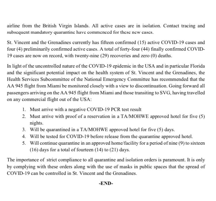 The release from NEMO say “Going forward all passengers arriving on the AA 945 flight from Miami and those transiting to SVG, having travelled on any commercial flight out of the USA: