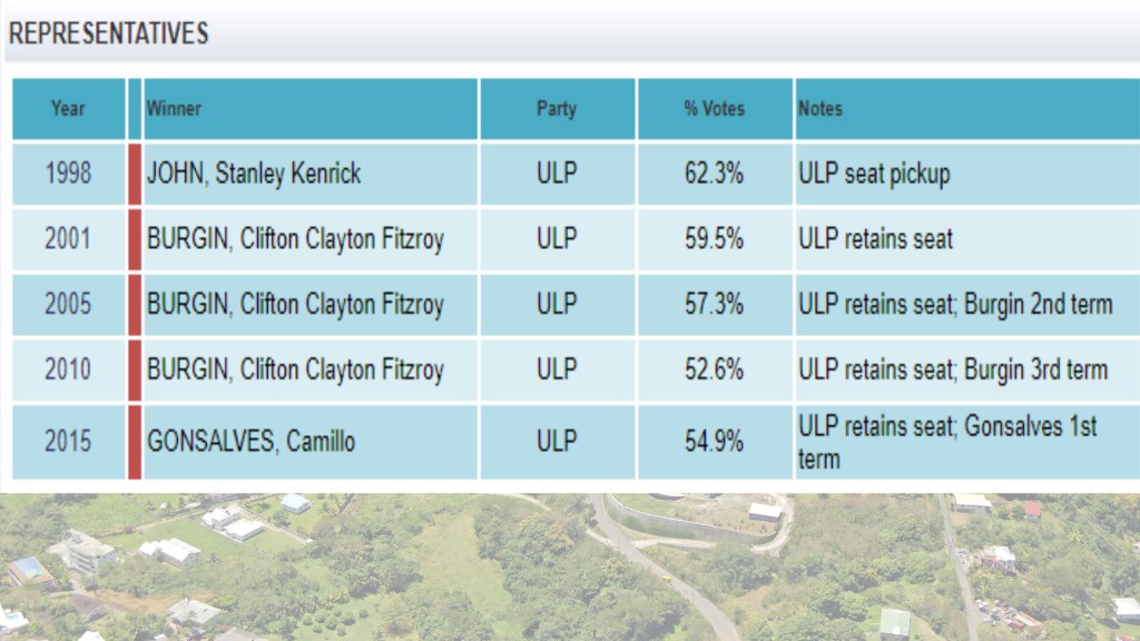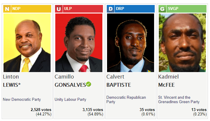 Camillo Gonsalves, who is the son of Prime Minister Dr. Ralph Gonsalves won the constituency in the 2015 General Election, his first time contesting in a general election. He succeeded Clayton Burgin who won the seat three times and left undefeated.