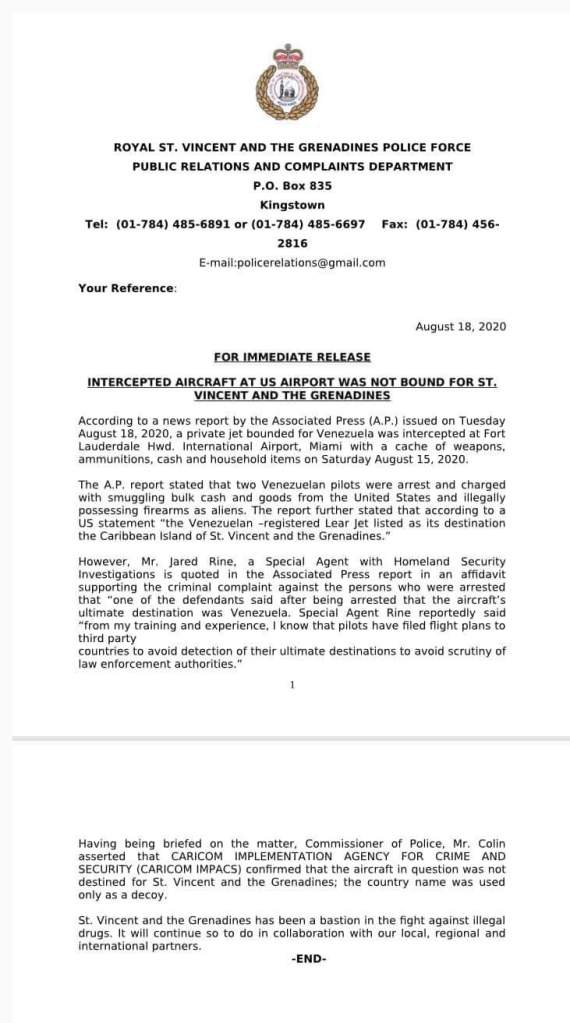 A release issued by the police late Tuesday, stated that Commissioner of Police in St. Vincent and the Grenadines, Mr. Colin John “asserted that CARICOM Implementation Agency For Crime and Security (CARICOM IMPACS) confirmed that the aircraft was not destined for St. Vincent”.