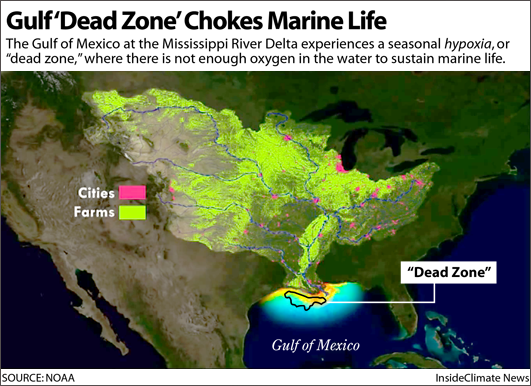 Eutrophication is the abundance of nutrients such as nitrogen and phosphorous which comes from sources including fertilizer run off, sewage, etc, which causes an outbreak of algae, depleting the oxygen in the water, causing marine animals and plants to die, which can further lead to a “dead zone” in the ocean.