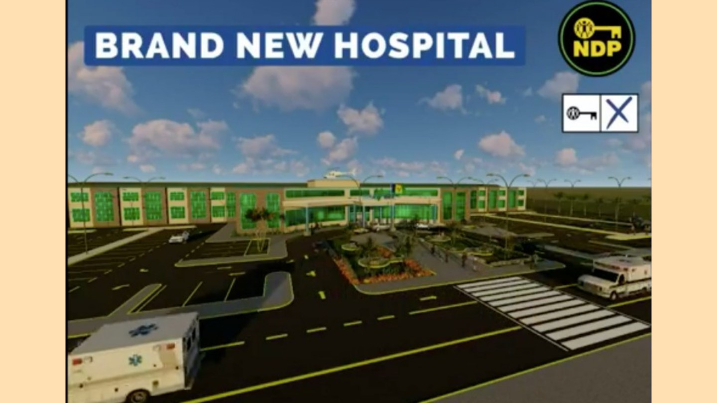 In the 2015 general election, the NDP had promised that if they won the general elections, they would construct a new hospital. The location was undisclosed, but some party officials touted the constituency of East St. George as the venue.