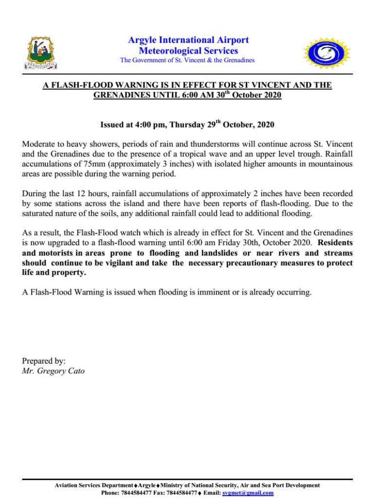 Kingstown, St. Vincent (ONE NEWS SVG) – St. Vincent and the Grenadines will remain under a Flash Flood Warning until 6:00 a.m., on Friday, October 30, 2020.