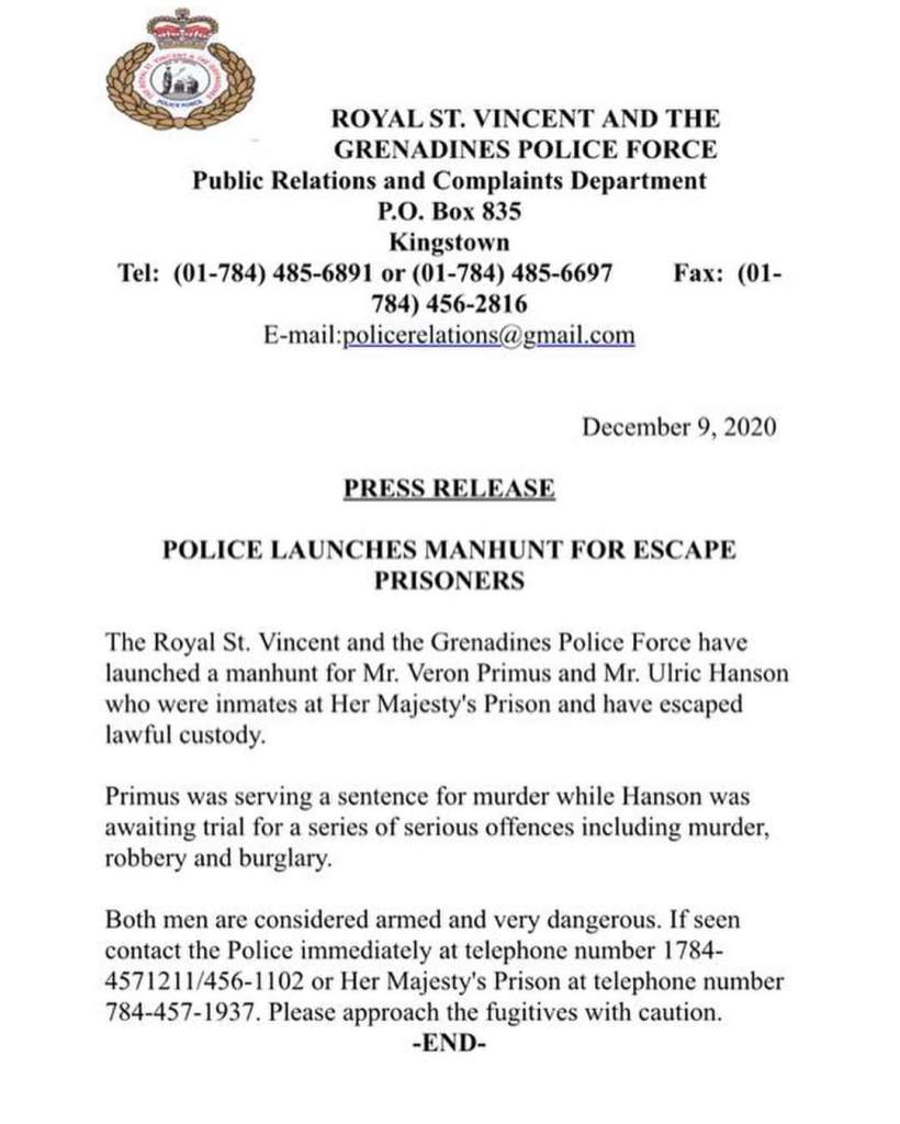 Kingstown, St. Vincent (ONE NEWS SVG) – The Royal St. Vincent and the Grenadines Police Force has launched a manhunt for two prisoners who escaped.