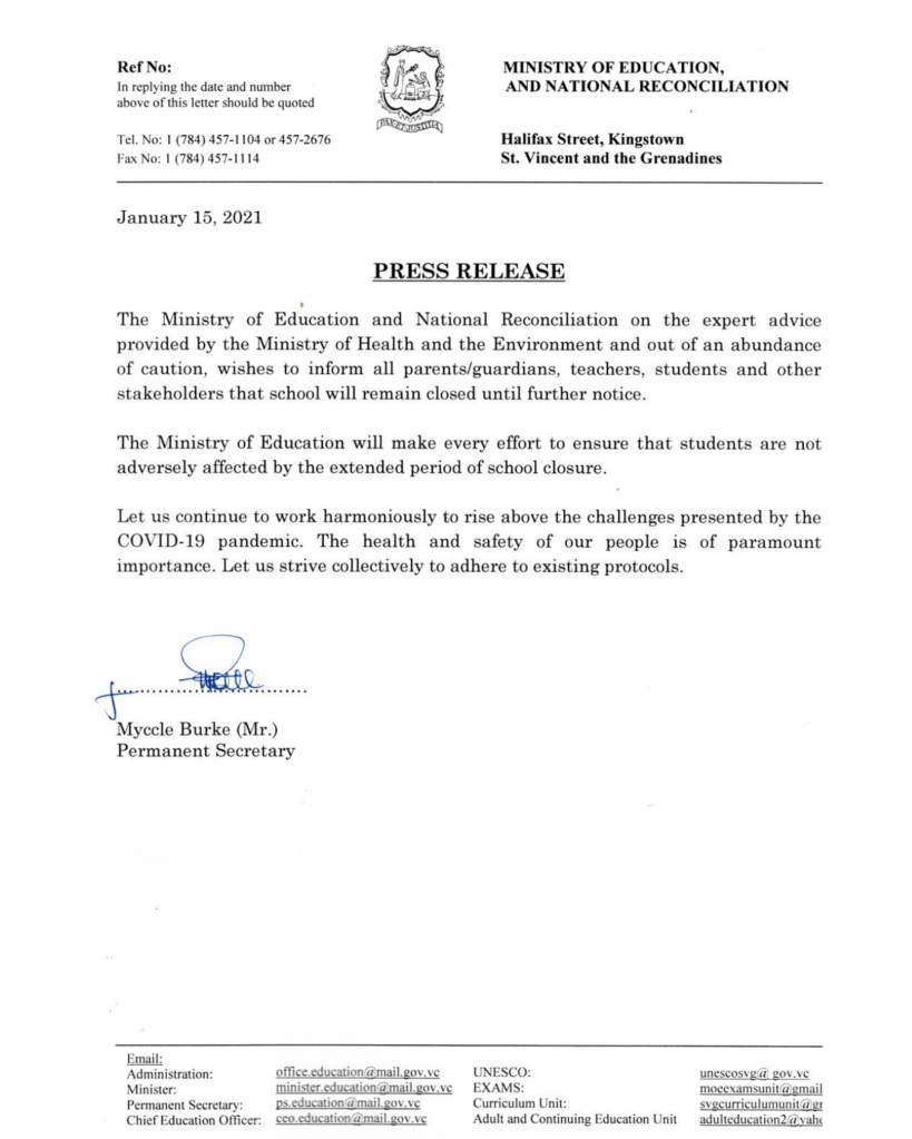 Kingstown, St. Vincent (ONE NEWS SVG) – Schools in St. Vincent and the Grenadines will remain closed until further notice, as the number of COVID-19 cases continues to surge.