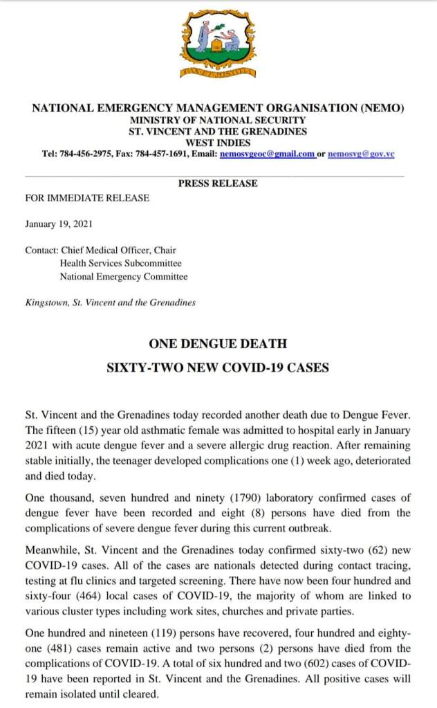 St. Vincent and the Grenadines today recorded another death due to Dengue Fever. The fifteen (15) year old asthmatic female was admitted to hospital early in January 2021 with acute dengue fever and a severe allergic drug reaction. After remaining stable initially, the teenager developed complications one (1) week ago, deteriorated and died today.
