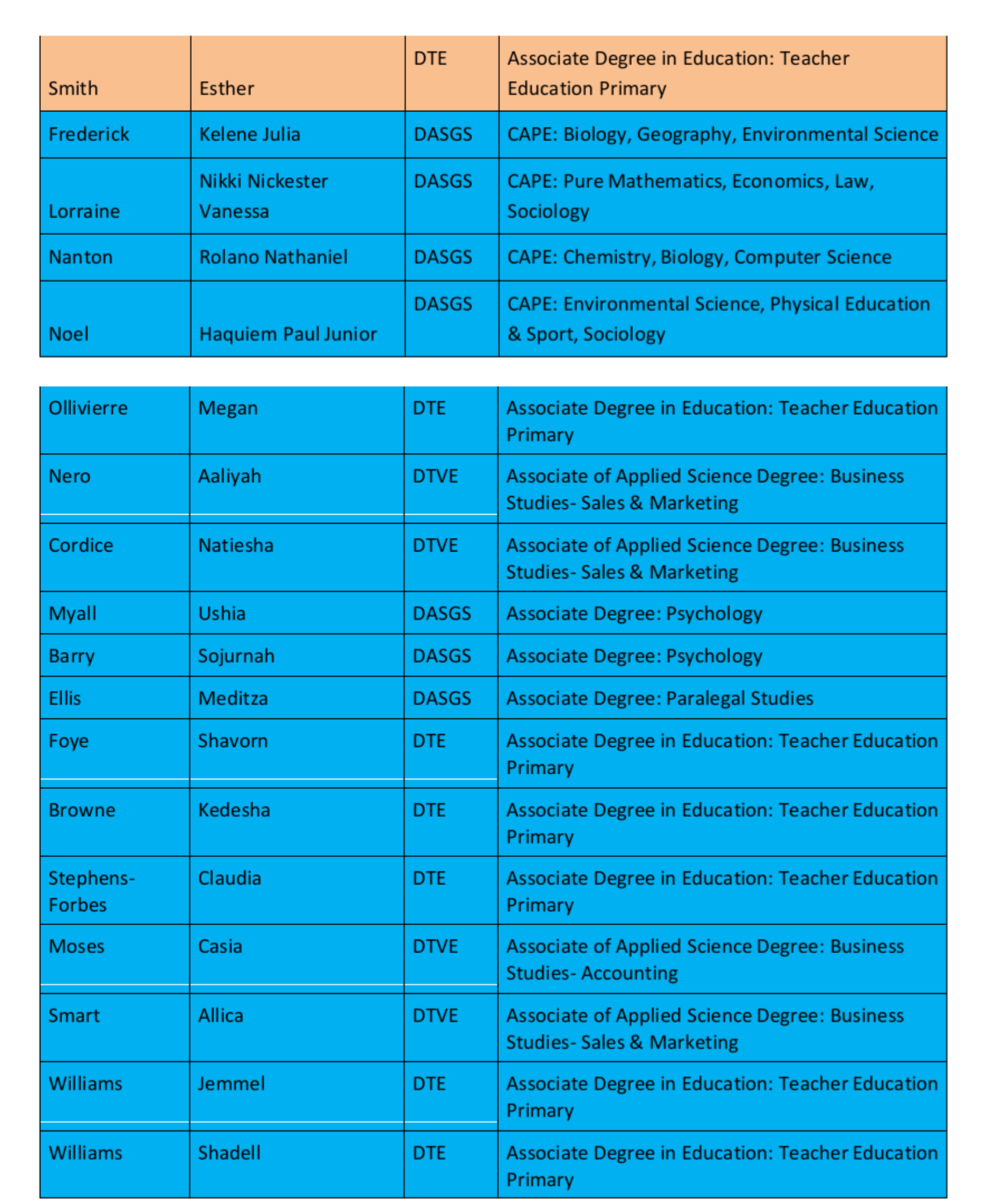 Three (3) graduates of the Division of Teacher Education have also been granted a three-year Developmental/Special Award in the area of Education for their commendable performance in the Associate Degree in Teaching – Primary Education. Based solely on the age limit of twenty-one (21) years applied to the National and Exhibition Awards, they could not qualify under the aforementioned categories. However, there is no fixed age limit for Developmental/Special Awards or Bursaries/Partial Awards.