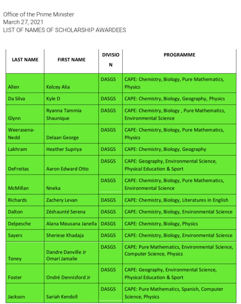 The Government of Saint Vincent and the Grenadines congratulates all of the recipients of scholarships, special awards and bursaries, and encourages our students to continue to strive for excellence and take full advantage of the opportunities that exists through the continued deepening of the education revolution.