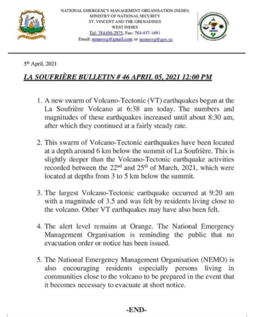 In its release, NEMO said a new swarm of Volcano-Tectonic (VT) earthquakes began at the La Soufriere Volcano at 6:38 a.m. today. The numbers and magnitudes of these earthquakes increased until about 8:30 a.m., after which they continued at a fairly steady rate.