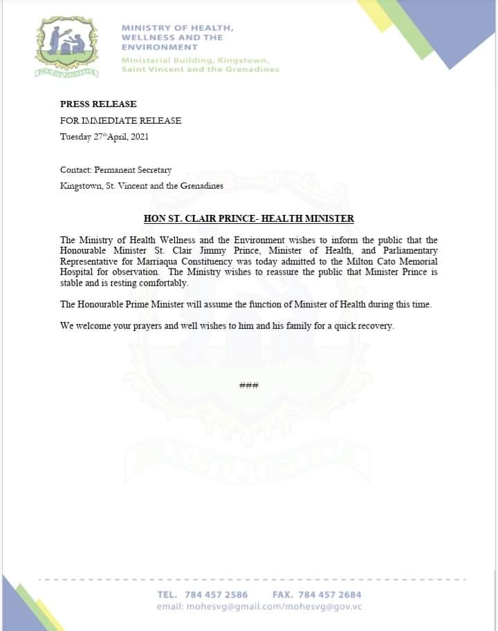 In a release issued on Tuesday, the health ministry said that Mr. Prince was admitted to the Milton Cato Memorial Hospital today (April 27), for observation.