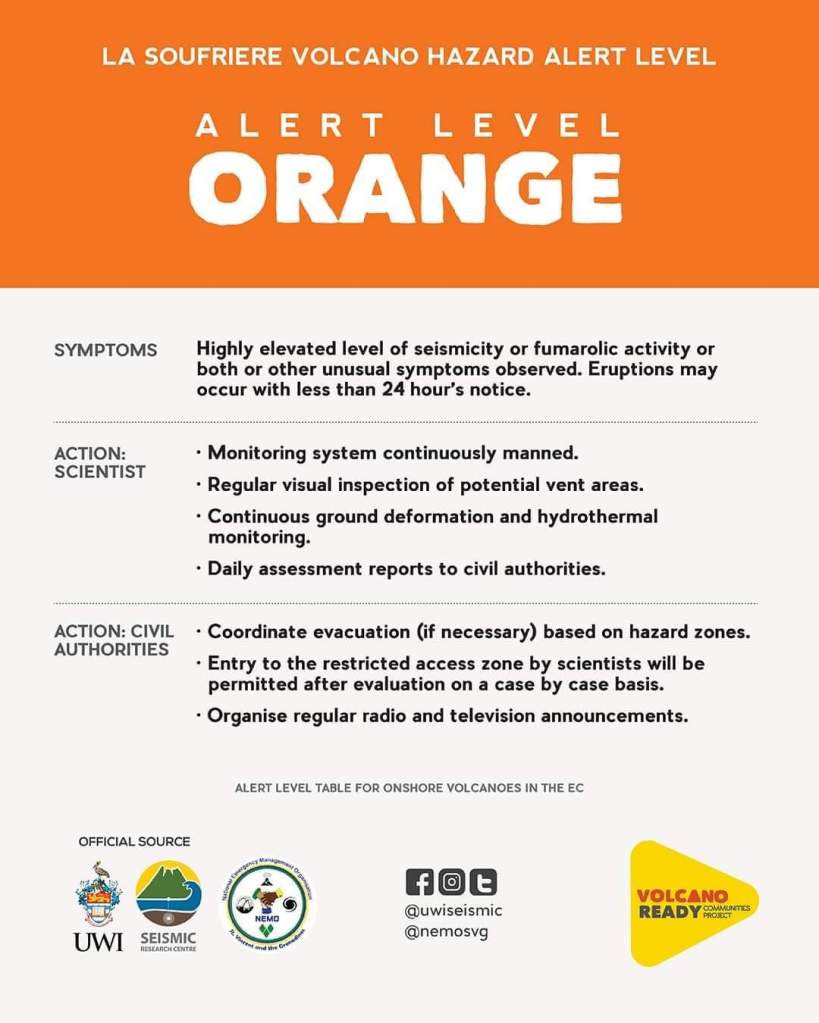 According to the National Emergency Management Organization – NEMO, “Orange Level means: Highly elevated level of seismicity or fumarolic activity or both. Eruptions may occur with less than 24 hours notice. Monitoring system continuously manned.”
