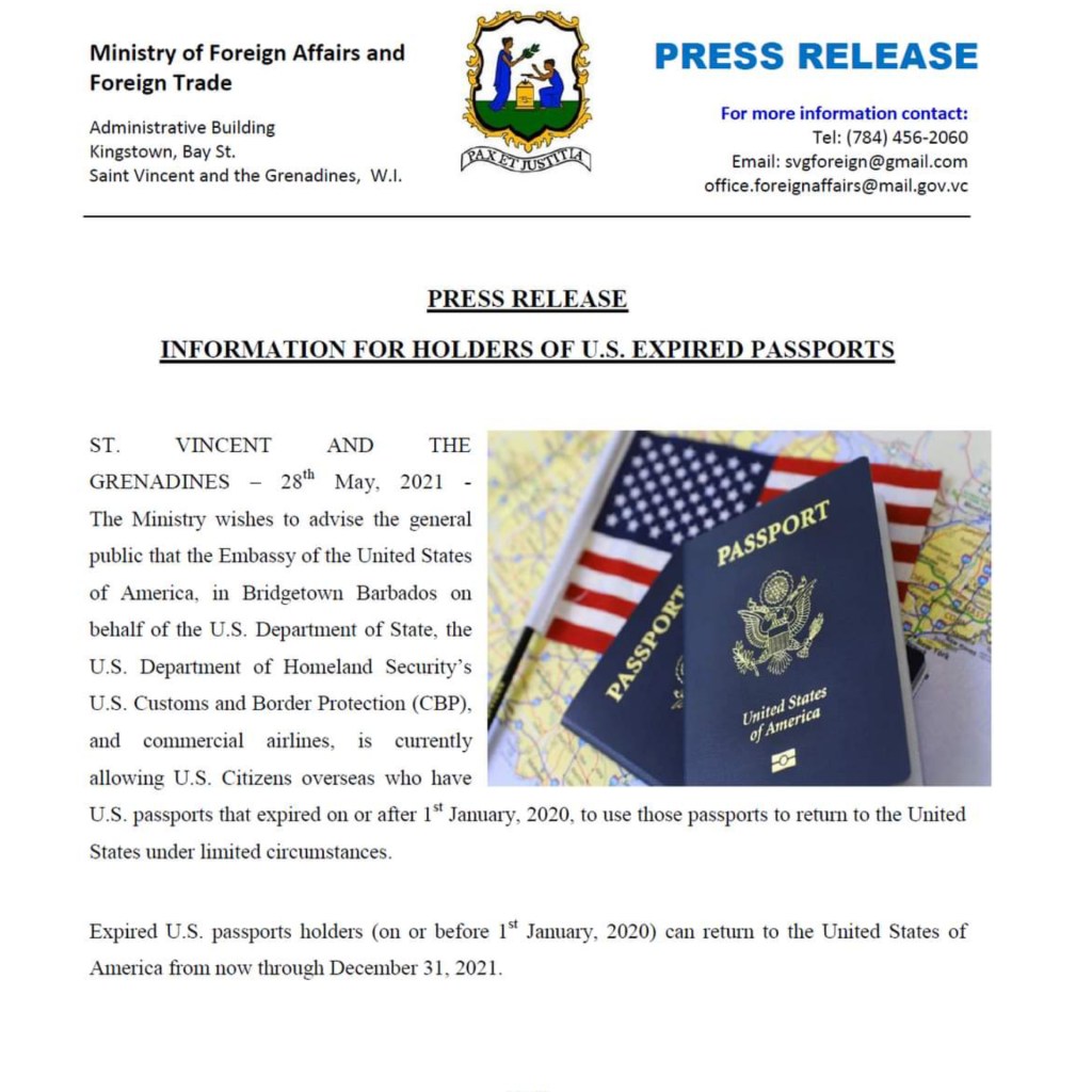 According to a press release from the Ministry of Foreign Affairs and Foreign Trade, in St. Vincent and the Grenadines, the U.S Embassy in Bridgetown, Barbados made the announcement on behalf of the U.S Department of State, the U.S Department of Homeland Security’s U.S Customs and Border Protection (CBP), and commercial airlines.