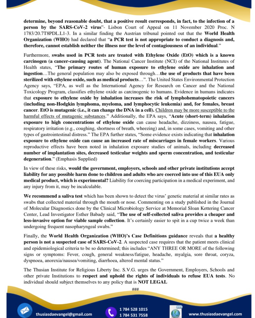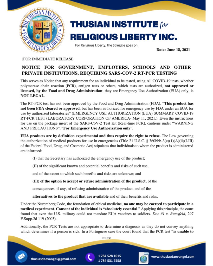 “Any requirement for an individual to be tested, using ALL COVID-19 tests, whether polymerase chain reaction (PCR), antigen tests or others, which tests are authorized, not approved or licensed, by the Food and Drug Administration; they are emergency use authorization (EUA) only, is NOT LEGAL,” the TIRL stated.