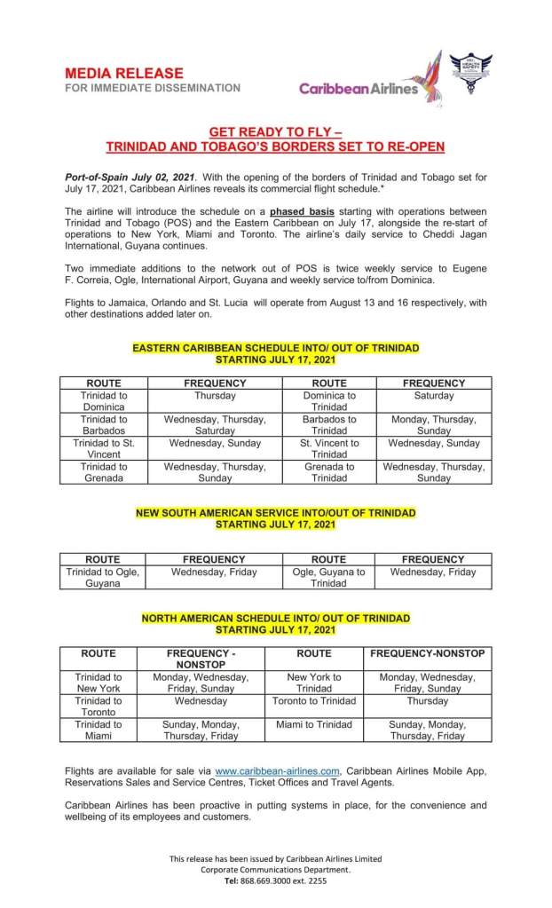 As Trinidad and Tobago plans to reopen its borders on July 17, 2021, Caribbean Airlines plans to resume commercial service to the Eastern Caribbean and other destinations.