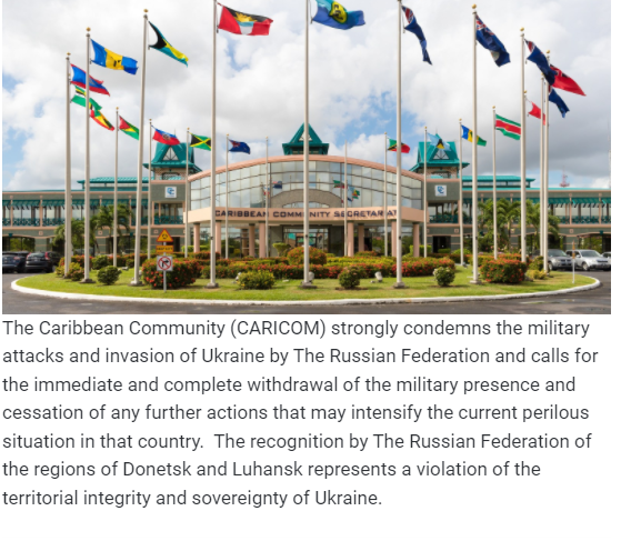 In a statement published today (February 24, 2022) on CARICOM’s website, the regional body says it is calling for Russia’s immediate and complete withdrawal of the military presence and cessation of any further actions that may intensify the current perilous situation in Ukraine.