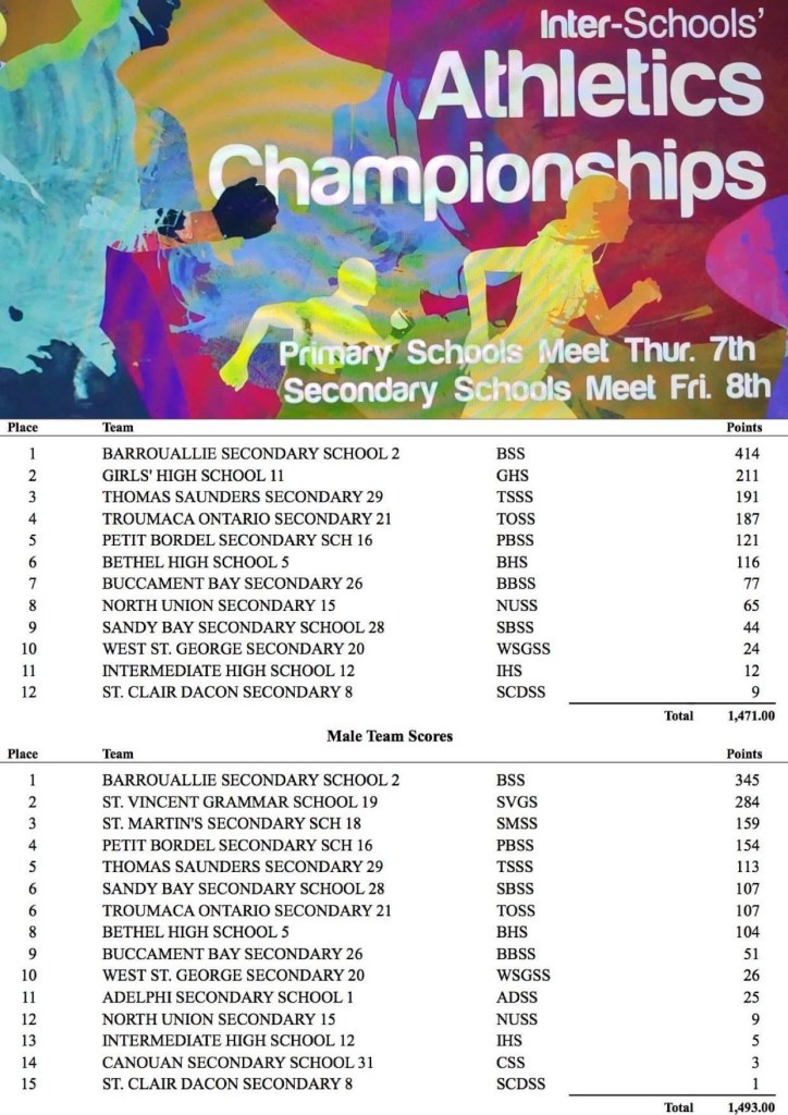 At the championships held at the Sir Vincent Beache Stadium on Friday (April 8), the Central Leeward Secondary, also known as the Barrouallie Secondary, won the girls’ championship with 414 points.