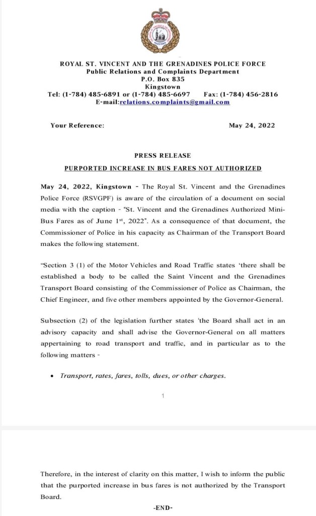 In a release issued on Tuesday, the RSVGPF said it is aware of the circulation of a document on social media with the caption – “St. Vincent and the Grenadines Authorized Mini Bus Fares as of June 1st, 2022”.
