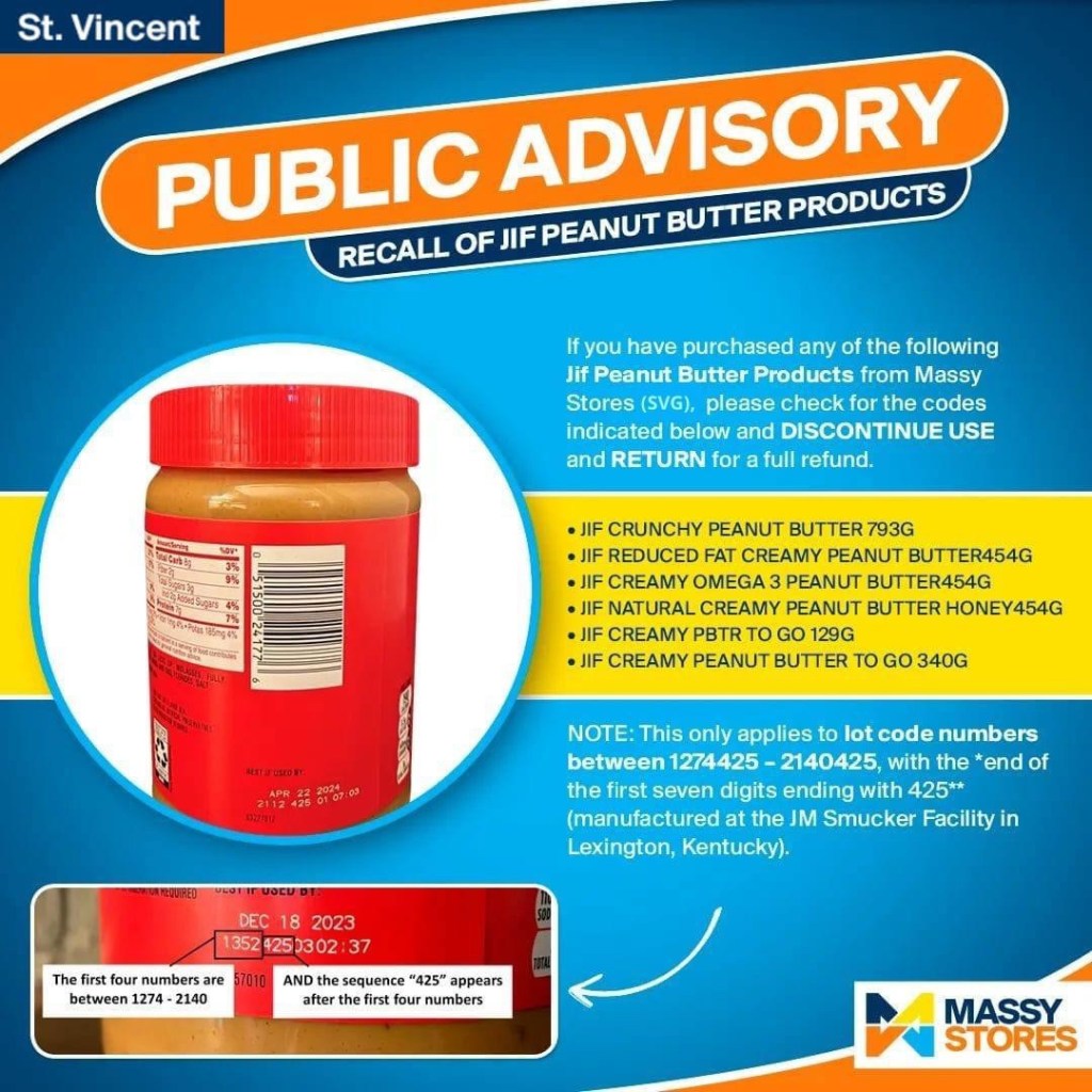 Massy Stores St. Vincent has issued a public advisory on the ongoing international recall of certain JIF Peanut Butter Products.