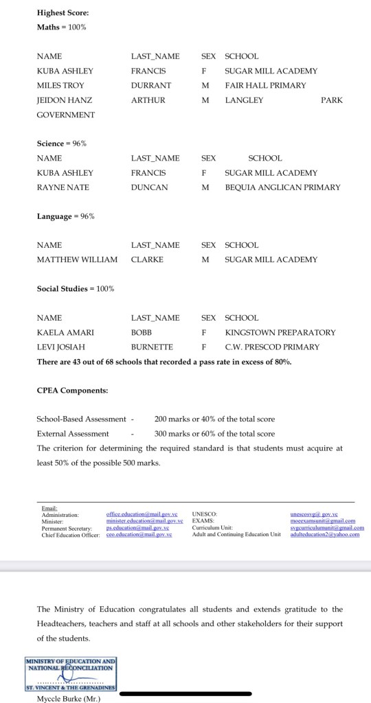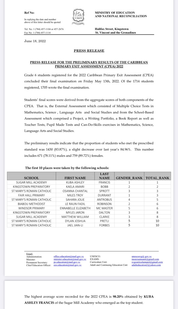 In second position for the 2022 CPEA results is Kaela Amari Bobb of the Kingstown Preparatory School, and third position was taken by Osanna Chantal Sprott of the St. Mary’s Roman Catholic School.