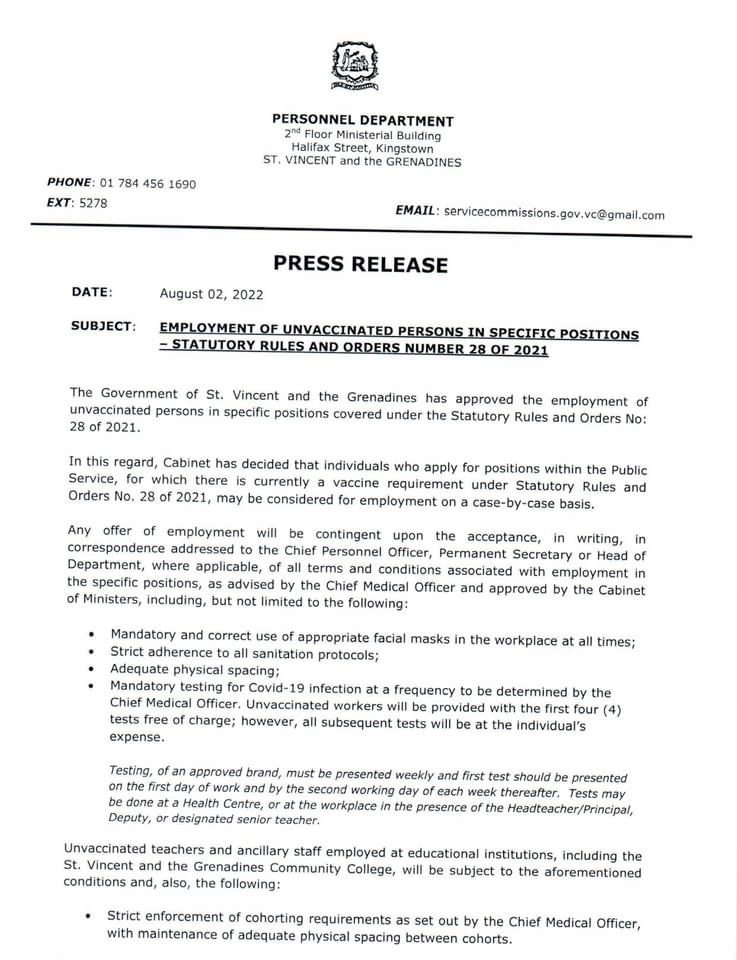 The Government of Saint Vincent and the Grenadines – SVG has approved the employment unvaccinated persons in specific positions covered under the Statutory Rules and Orders No. 28 of 2021.