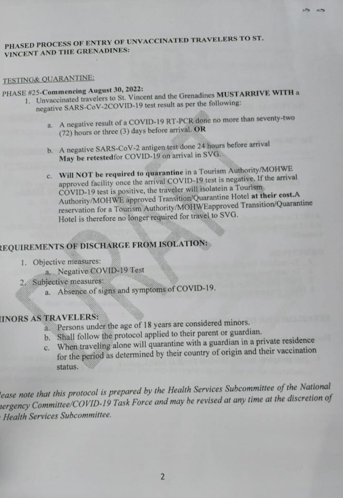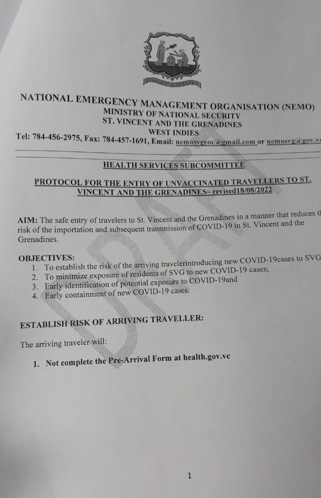 In the document by the Health Services Subcommittee of the National Emergency Management Organization – NEMO, the protocol for entry of unvaccinated travelers to Saint Vincent and the Grenadines was revised on August 18, 2022.