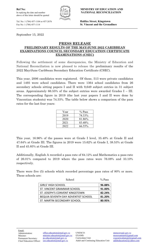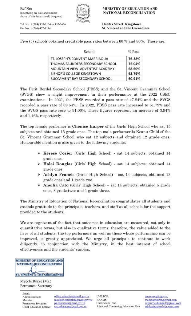 The second best performance for Saint Vincent and the Grenadines in the 2022 CSEC results was from the St. Vincent Grammar School with a 91 percent pass rate.