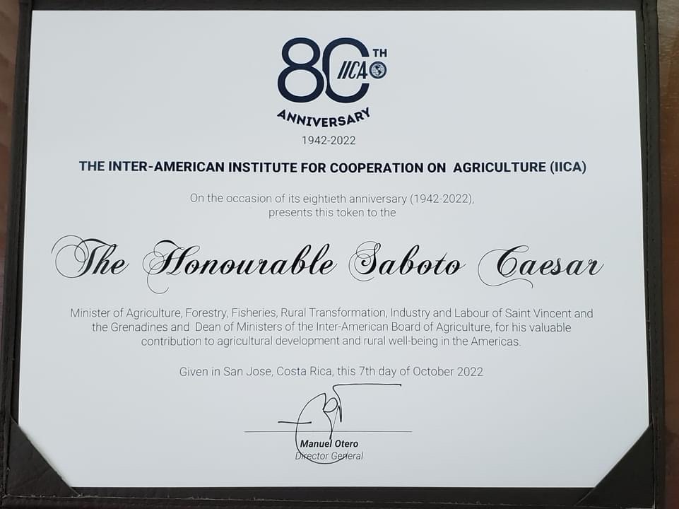 San Jose, Costa Rica – The Minister of Agriculture of St. Vincent and the Grenadines, the Honourable Saboto Caesar, received an award of excellence from the Inter-American Institute for Co-operation on Agriculture (IICA) at the organization’s 80th Anniversary Ceremony held at the IICA headquarters in San Jose, Costa Rica on Friday October 7, 2022.