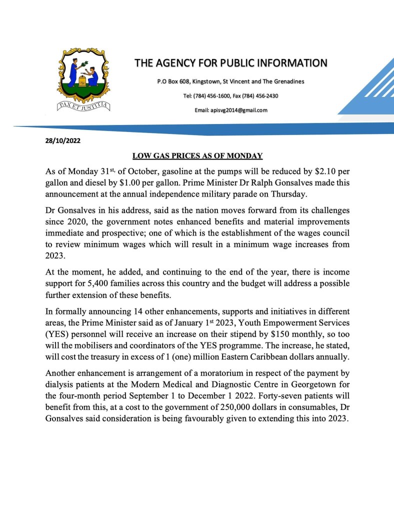 According to the State-owned Agency for Public Information – API, the price change was announced by Prime Minister Dr. Ralph Gonsalves during his independence address.