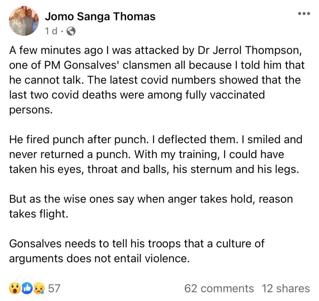 On Saturday, December 17, 2022, an incident occurred between myself and Mr. Jomo Thomas, a man for whom I always had a lot of respect. The incident occurred at Heritage Square in Kingstown and was witnessed by several persons close to us.