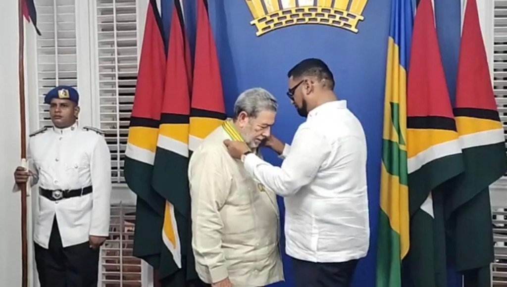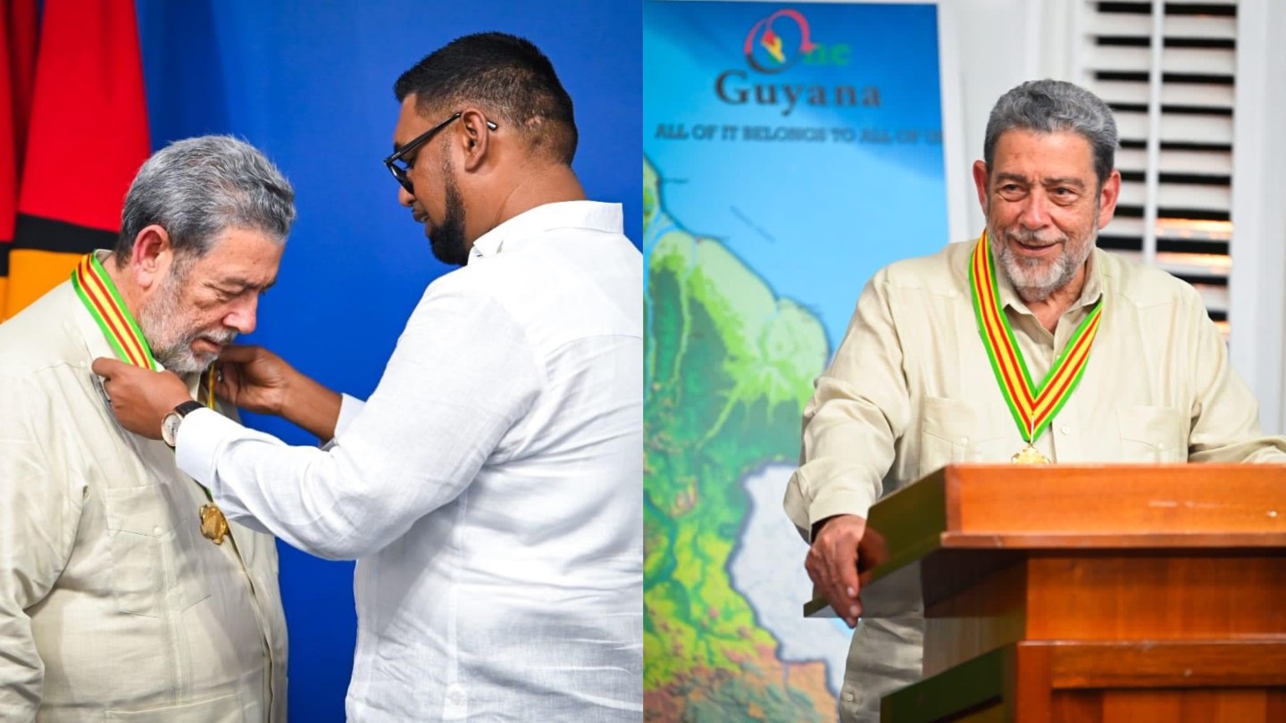 Prime Minister Dr. Ralph Gonsalves who is on a four-day official visit to Guyana received the honour from Guyana’s President Irfaan Ali at a ceremony.