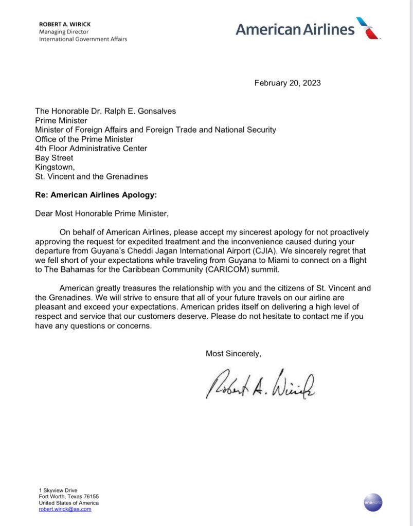 In a letter dated February 20, 2023, Managing Director of International Government Affairs of American Airlines – Robert Wirick asked Prime Minister Gonsalves to “please accept my apology for not proactively approving the request for expedited treatment and the inconvenience caused during your departure from Guyana’s Cheddi Jagan International Airport.”