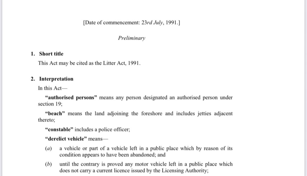 The law also states that “until the contrary is proved any motor vehicle left in a public place which does not carry a current license issued by the Licensing Authority,” is a derelict vehicle.