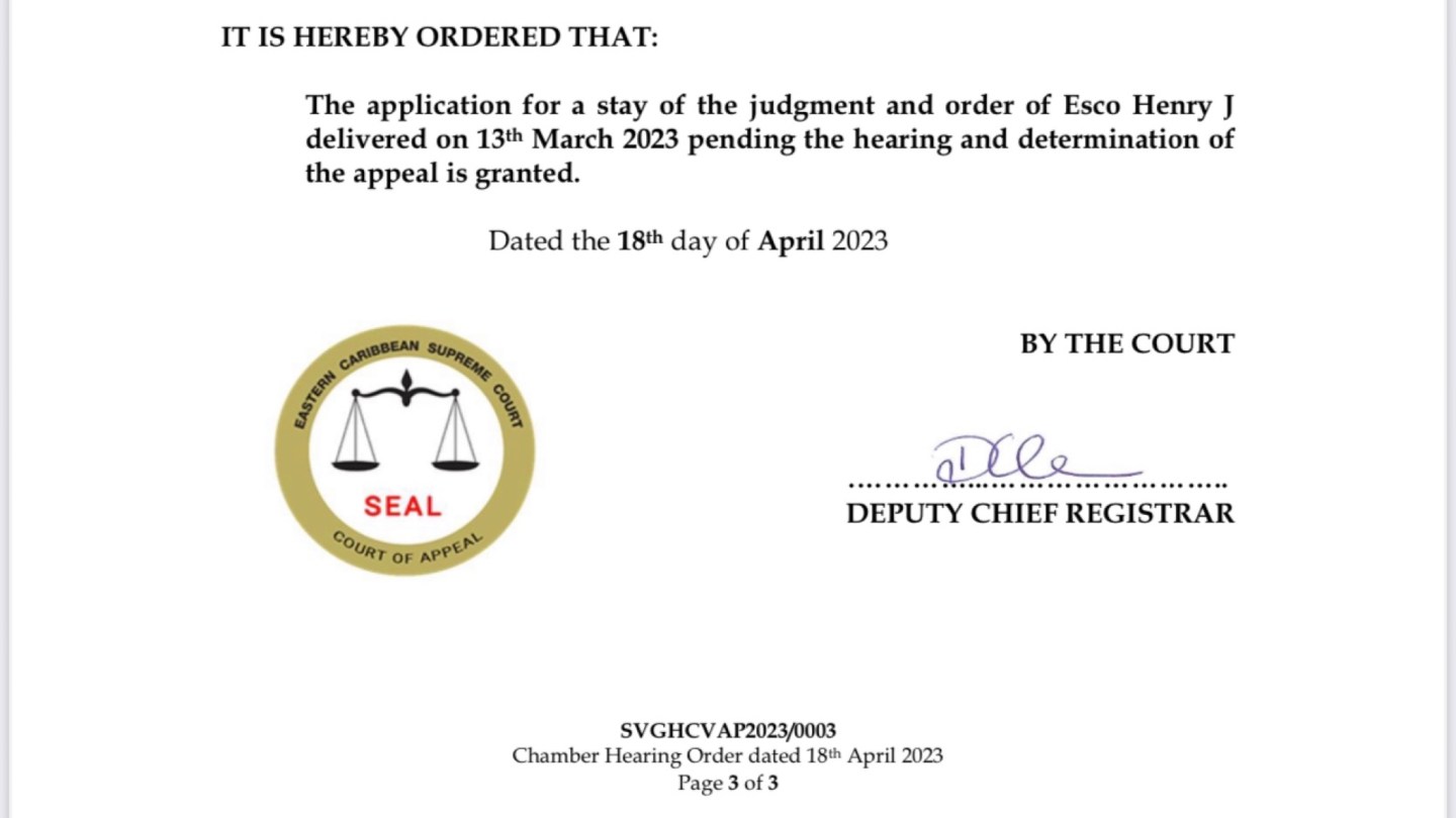 The Court of Appeal, on April 18, ordered that an application for a stay of the High Court judgment and order of Justice Esco Henry delivered on 13th March 2023 in the “vaccine mandate case” is granted.