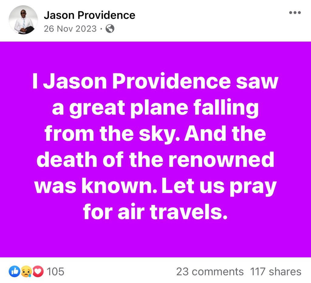 In the November 26, 2023 post, Jason Providence said: “I Jason Providence saw a great plane falling from the sky. And the death of the renowned was known. Let us pray for air travels”.