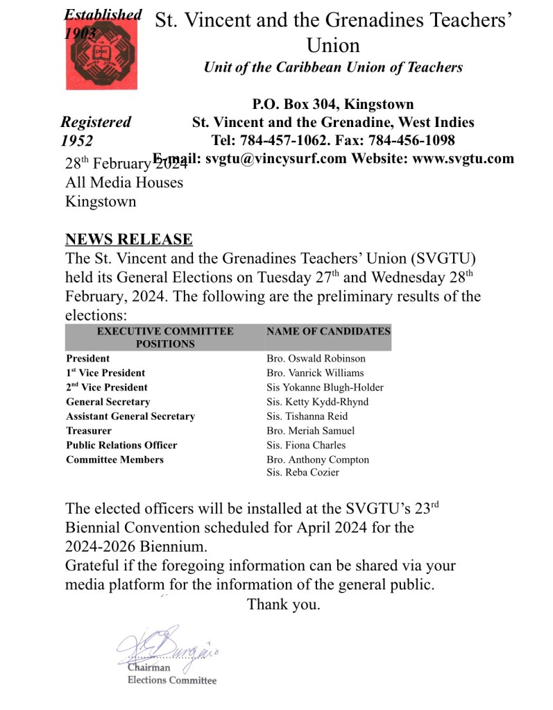 The SVGTU said the elected officers will be installed at the SVGTU’s 23rd Biennial Convention scheduled for April 2024 for the 2024-2026 Biennium.