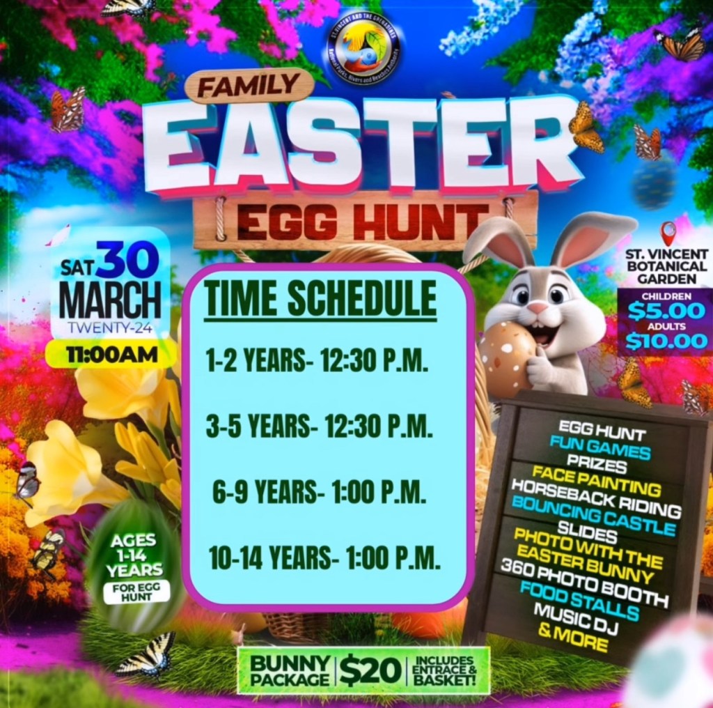 Officer in charge of Public Relations – Ms. Twanique Barrow told One News SVG on March 29 that an Easter Egg Hunt will be held at the Garden on Saturday, March 30, 2024 from 11:00 a.m.
