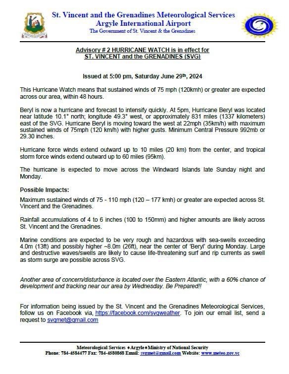 In a 5:00 p.m., Advisory today (June 29) the Met Office reiterated that a Hurricane Watch remains in effect for St. Vincent and the Grenadines.
