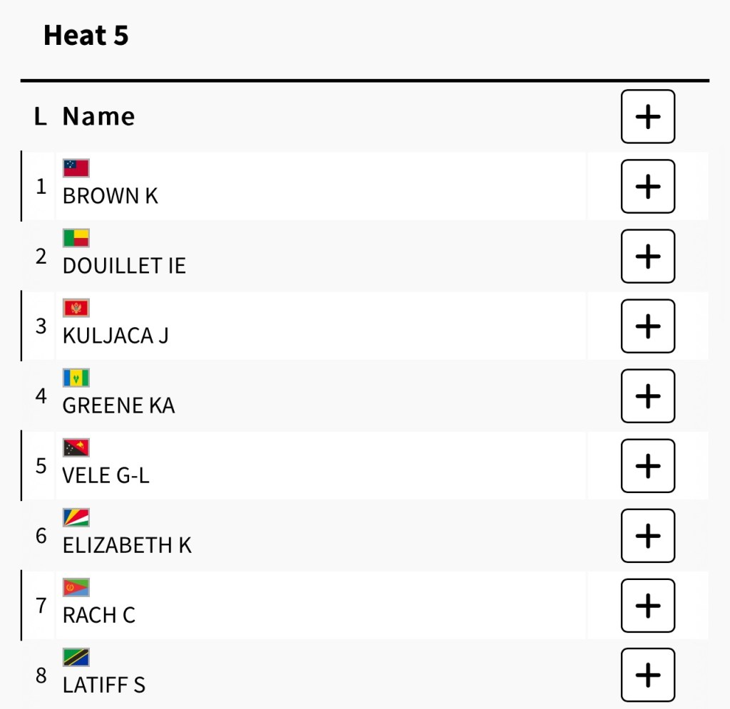 No information is available yet on the Paris Olympics website about names of athletes, lanes and heats/rounds for the athletics 800-metre events.