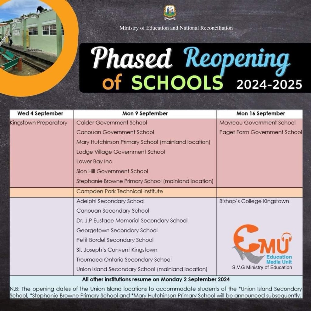 The Ministry said the Kingstown Preparatory School will open for the new school term on Wednesday, September 4.