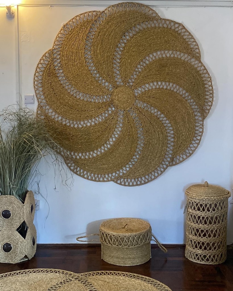 The vetiver grass is now grown in the prison’s vetiver systems farm set up in 2022 by Hand2Earth and sponsored by SVG Conservation Fund. After harvesting, it is put to dry on racks. Prisoners then take the dry grass and plait it into ropes. These ropes are used to create the artworks by combining and sewing them together in creative ways. They make baskets, mats, bags, hats, and even stools.