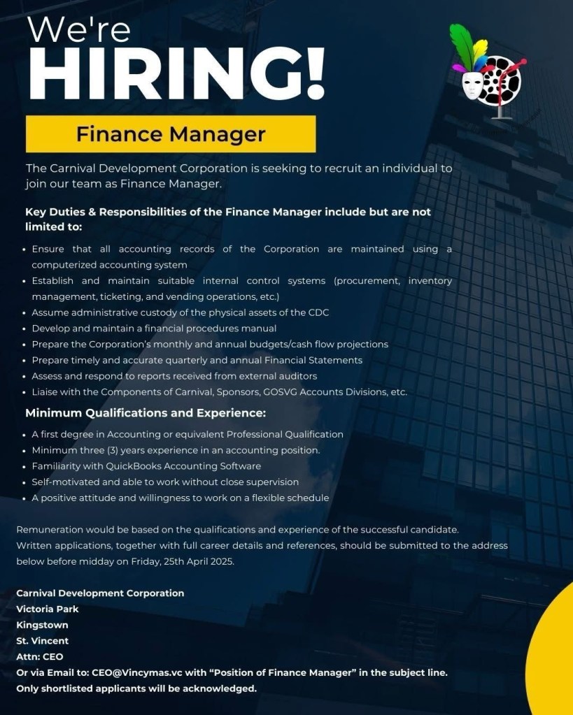 VACANCY #1: Finance Manager at Carnival Development Corporation.